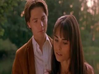 Jordana Brewster of The Fast and the Furious fame making out with a guy in a bedroom, unbuttoning her pink shirt and taking it off to briefly show her left breast.From Nearing Grace.