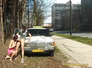 Nasty lady in full action outdoor at my taxi car