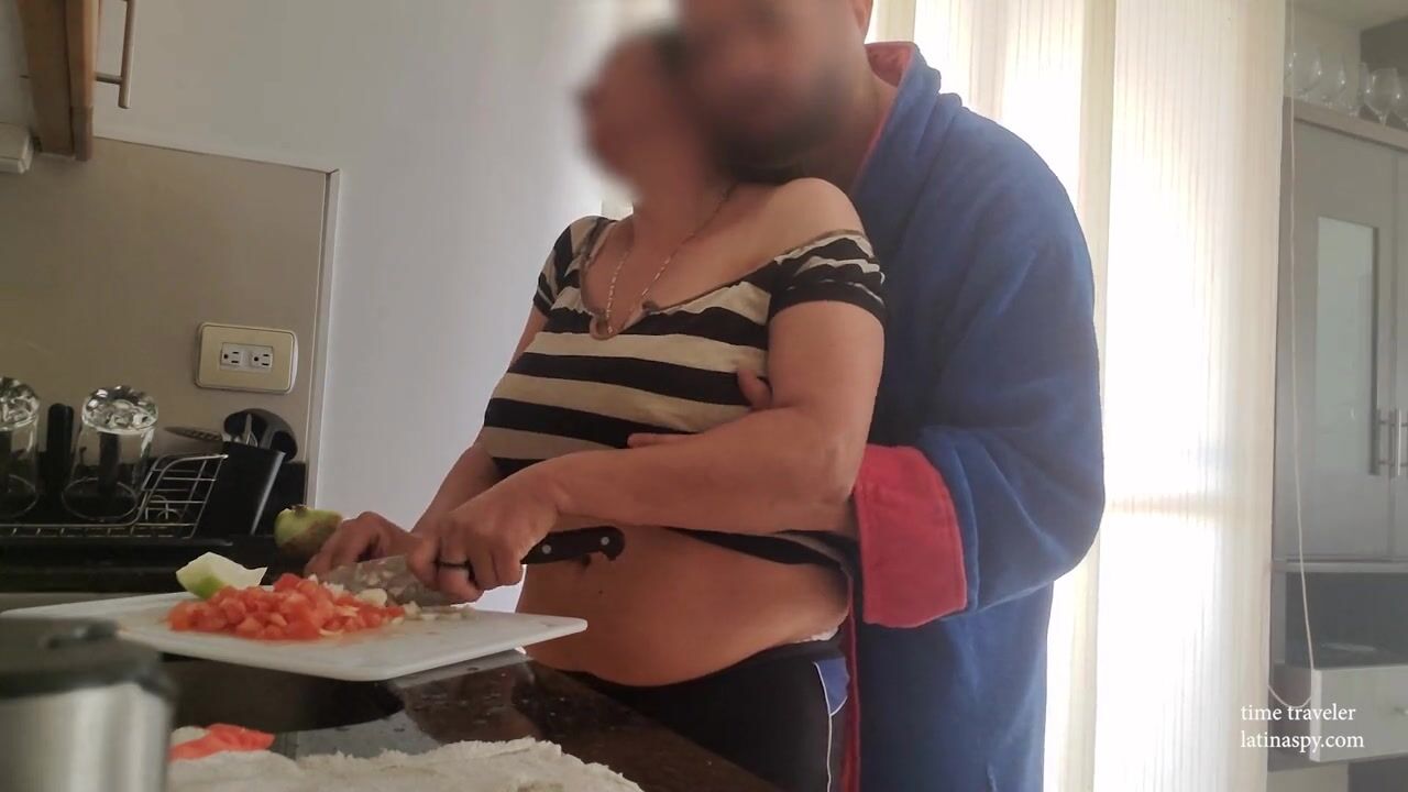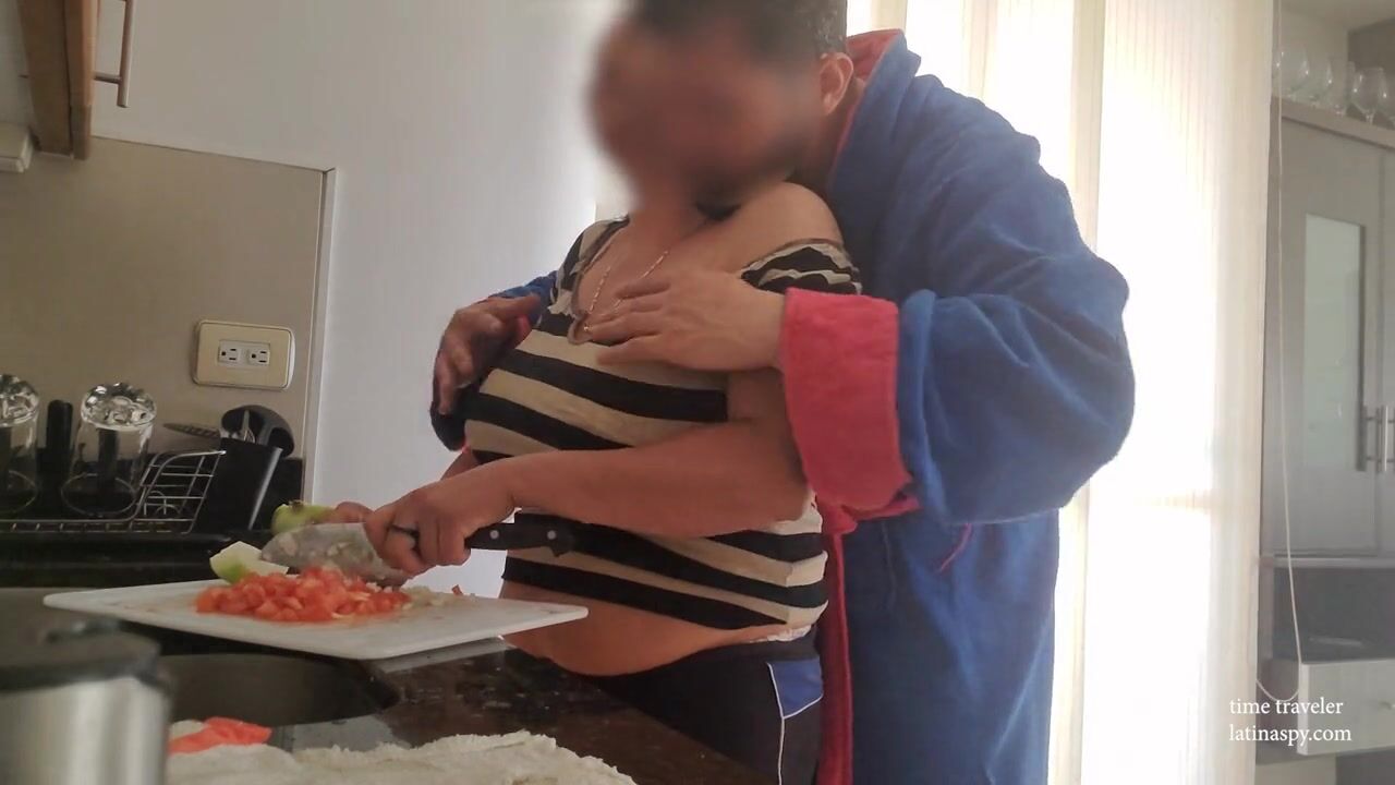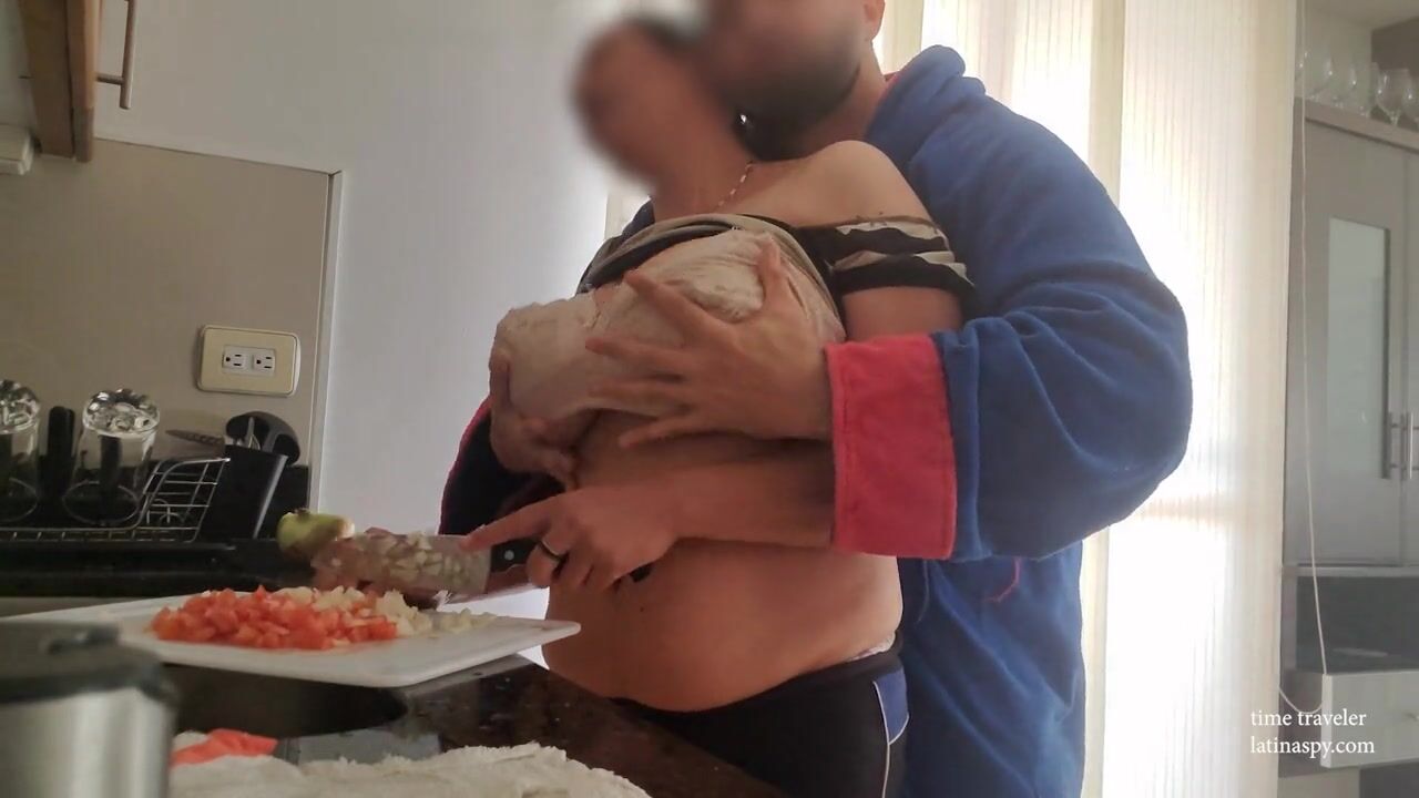 while this big natural breast maid was cooking her boss came to the kitchen and decided to help himself with those huge ass breasts while she was busy there was no need to play around just grabbing big tits and pulling them out