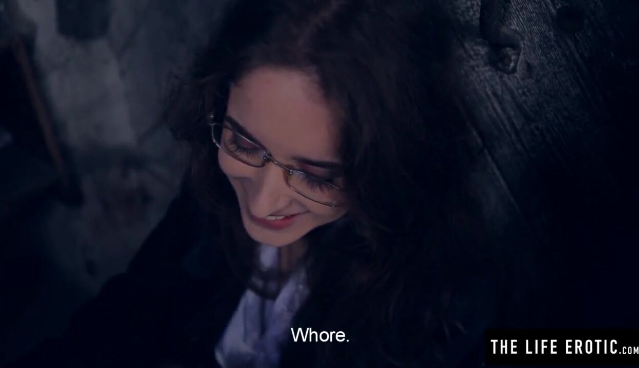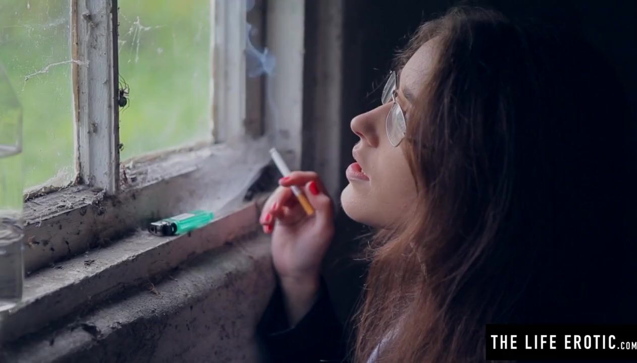 Angry girl in glasses with puffy nipples masturbates hard in the dirty alley
