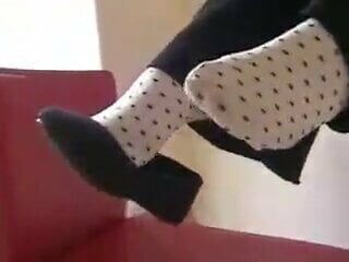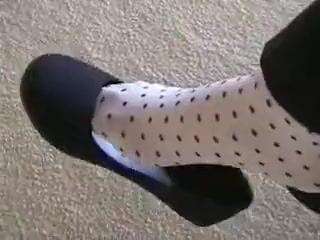 Woman shoeplaying in polka dot socks and ballet flats before being devoured.