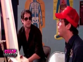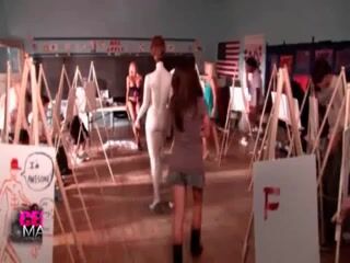 Nikki Schieler teaching an art class in a bustier, which she lowers to reveal her breasts as she chats with some students. The class is then dismissed, and three guys watch as Nikki runs